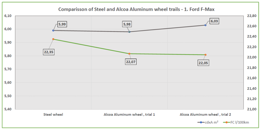 Overall, fuel consumption decreased by 1.29% when replacing steel wheels with aluminium wheels